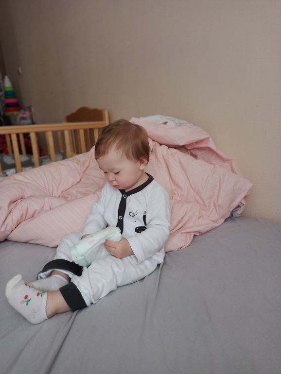 Про сон. Ночной сон долгий. 12-13 часов. Днём спит один раз 2.5 часа. Редко бывает 2 сна, но в совокупности они также по времени. Любит спать со мной, или Я хотя бы должна быть в поле зрения - кровати стоят рядом. Днём спит либо на улице, либо сама с бутылочкой засыпает в кроватке.