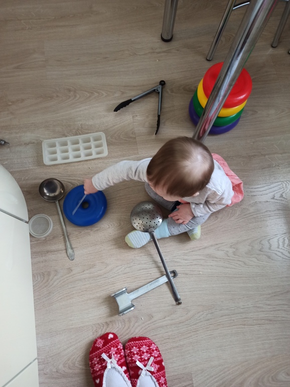 Что у нас нового за месяц? Алиса научилась ходить в обуви. Мне просто надоело таскать её в магазине на руках, и вот я решила, что пора приучать. Сначала дома сандали одели - Алиса сидела в них ровно на попе не двигаясь, иногда стуча пяткой об пол. Через пол часа встала у дивана. А потом пришла старшая сестра со школы, и Алиса, видать забыв про то, что она в обуви, радостно к ней побежала. На второй день дома были уже освоены валенки, А на третийтретий- уже небольшая пешая прогулка по снегу, за руку - но идёт!!! Стала приседать на корточки, как "реальный пацанчик с района" И может несколько минут так сидеть и что-то делать. Вообще любит везде лазить - внутри стульев, за мебелью, перелазить всякие препятствия, особенно если папа лежит с ней на полу, сто раз через него туда-обратно переползает. Может составить в кучу несколько стульев и ползать между ножек, как по лабиринту. И вообще всякие логические перемещения, что и куда подвинуть, чтоб пролезть или достать, делаются просто. Любит играть в догонялки. Убегает и хохочет. Любимыми занятиями по прежнему остаются - все достать ото всюду и раскидать. Это она мне квесты такие по несколько раз в день устраивает, называется попробуй найди теперь, где и что лежит. Но иногда и сама кладет на место. Вот например - сорвет шарик елочный, походит с ним, и идёт кладет обратно на елку - иногда даже успешно (елку хоть и боялись, но решили поставить, пока вроде живая)