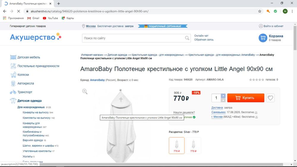 Мы покупали крестик, крестильную одежду не брали, а только крестильное полотенце, выбрали самое красивое бренда amarobaby, оно большое и полностью обернули в него малыша, после купели надели и уголок. Мне, кажется, больше ничего и не надо.