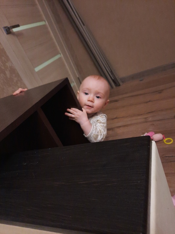 С папой у нее космическая связь, он только поднимается по ступеням в подьезде, а она с радостным писком папа, ползет к двери.