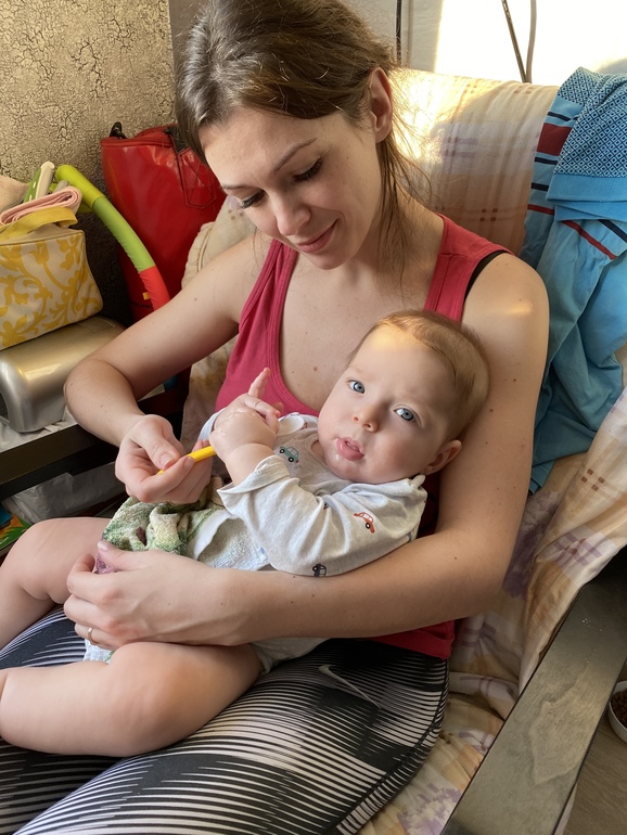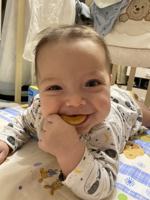 Учитывая зуб и приближающиеся полгода мы ввели прикорм. Хоть ему и не очень интересна человеческая еда, отвлекался на тарелку или вилку.