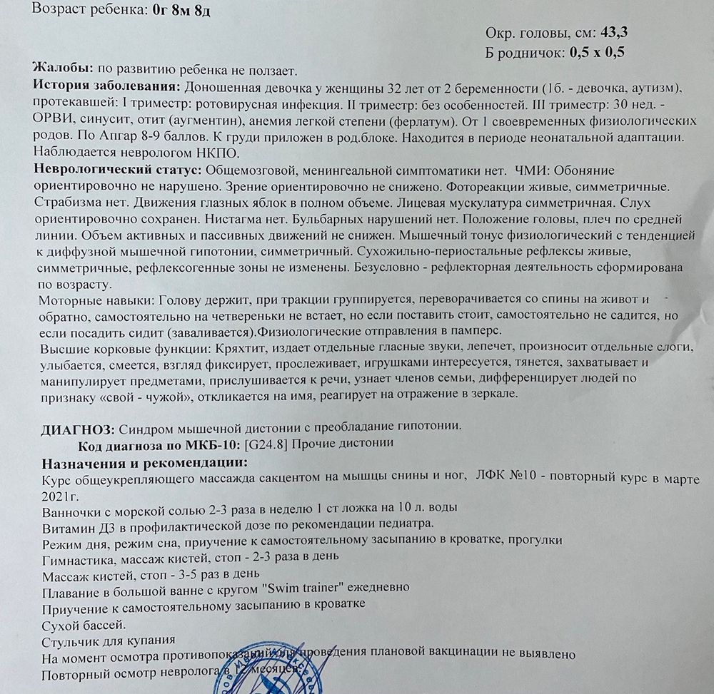 В общем, из рекомендаций, это массаж в 9 мес, ванны с солью. И без паники))) говорит может так и до года с лишним пробатониться, пока не встанет и не пойдет. Ну и еще назвал как-то по научному, что вес не сбрасывает из-за недостатка активности. Говорит вес у нас на год 🤪 9600. Но тут ничего не поделать, пока не пойдет))