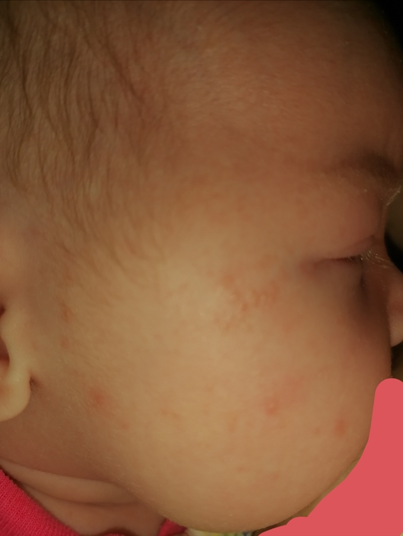 Физическое развитие4 дня назад, появились высыпания, дочке 1 месяц и 1 неделя, спит, ест, ходит в туалет без особенностей, спокойеая, активная, весёлая. Высыпания на щеках, на шее сзади и на волосистой части головы