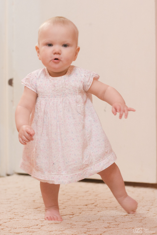 Предпринимает попытки сделать шаг. Раскачиваясь на обеих ногах, отрывает одну стопу от пола на долю секунды и старается переставить её вперёд. Несколько раз удавалось, на сантиметров пять. Падать назад плашмя стала намного реже, ура. Группируется при падении, и в целом лучше держит равновесие.