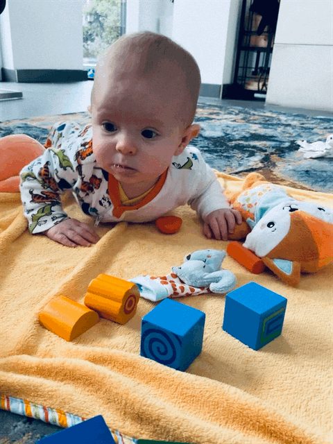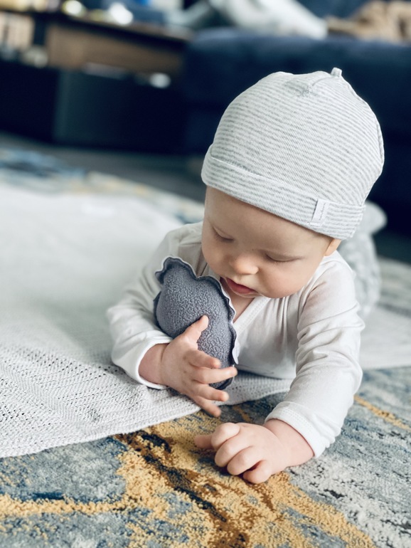 Вообще руки в положении на животе отлично у Сашульки работают. Он уже и перекладывает из одной в другую (в этой позе это сложнее чем на спине), и держит две/играет двумя одновременно. Пока замечаем, что правая ручка активнее. Наверное, у нас, двух левшей, растет второй правша😜