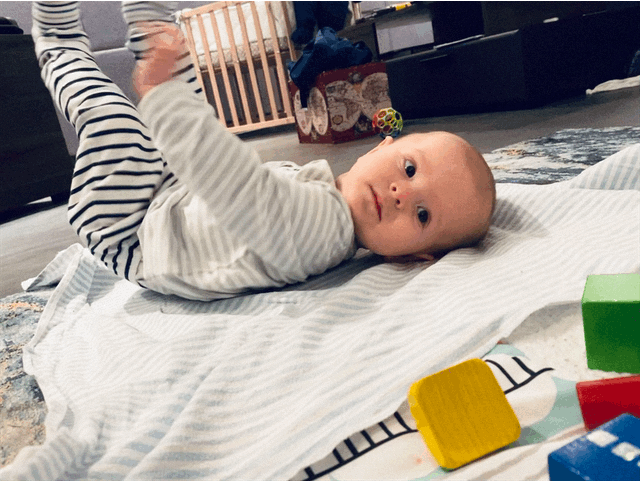 ✅08.01. - начал поднимать ноги вверх, хватать их и играть с ними!)