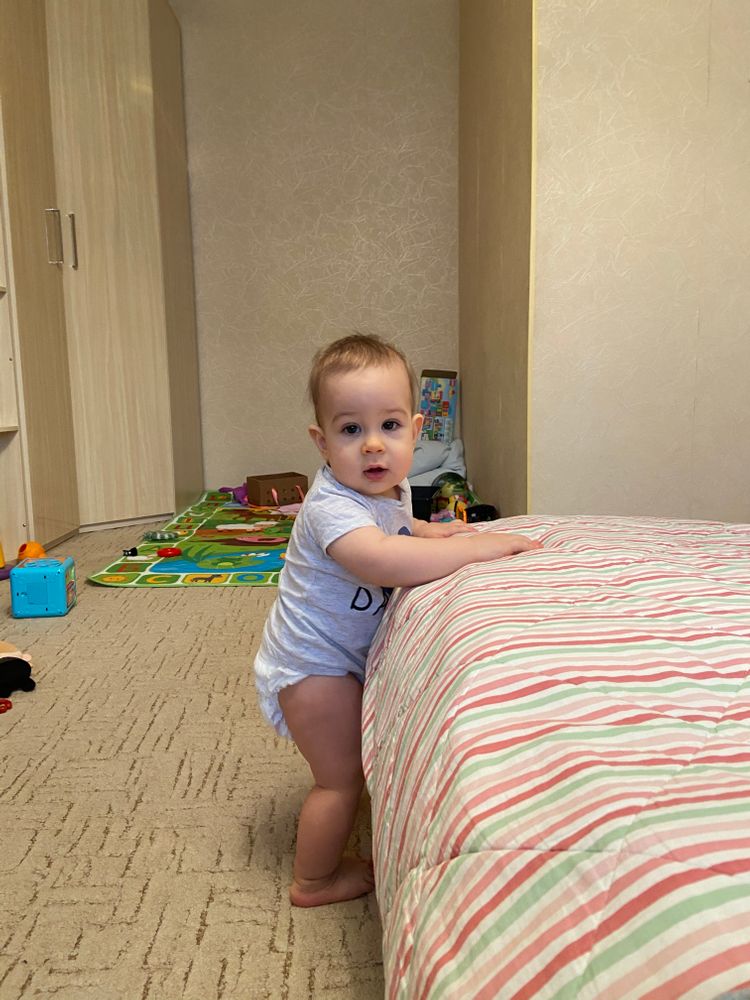 Физически развит хорошо, на четвереньках бегает, вдоль опоры практически тоже бегает, встаёт на ноги за доли секунды, может стоять без опоры, но шажки делать пока боится. Хотя за ручки топает активно!