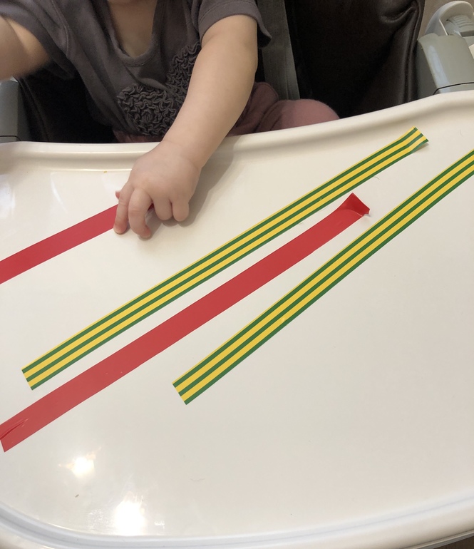 Изоленты из фикспрайса, кончики подгибаем, приклеиваем на столик. Ребёнок тренирует пинцетный захват и мелкую моторику.