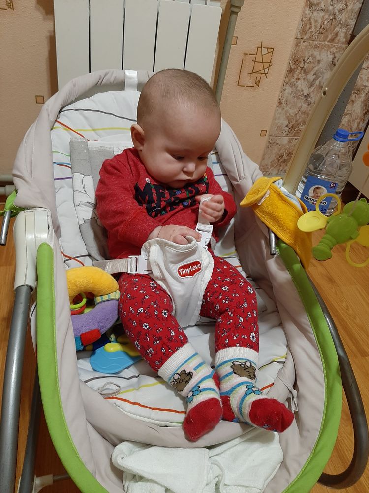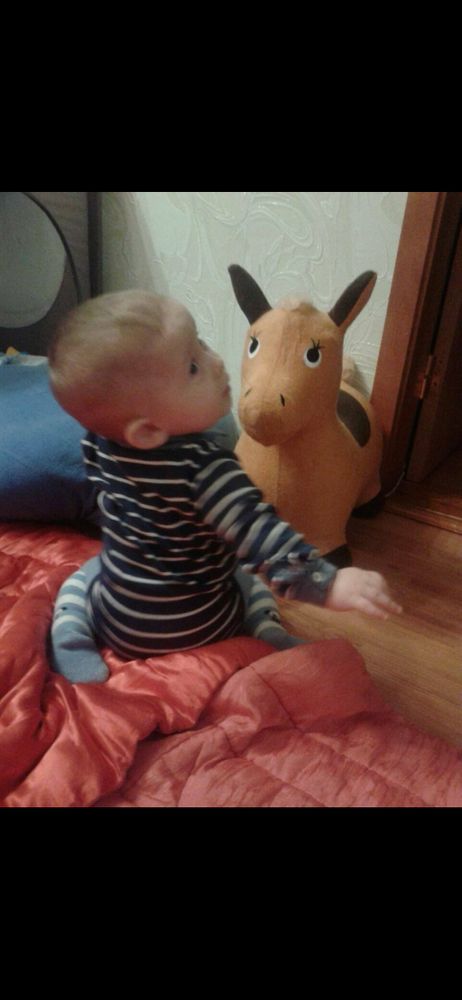 Пока не крутится по оси, не ползает никак. Много ноет, что не получается. Ну да ладно, руки накачает, думаю начнёт и это.