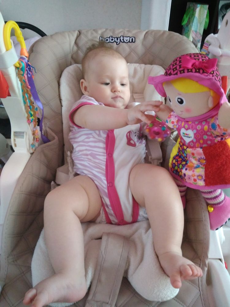 Отлично зашли все музыкальные игрушки: пианино, ксилофон, игрушечный телефон с песенками. Начала пританцовывать в такт, сначала качая головой, потом как червячок дрыгаясь и т.д.). С 4мес идеальная отвлекалка- самодельная игрушка. На кольцо от коврика навязала разных шнуров, ленточек, тесёмочек, на них бусины. Очень нравится перебирать, какие-то жуёт, некоторые именно двумя пальчиками берет.