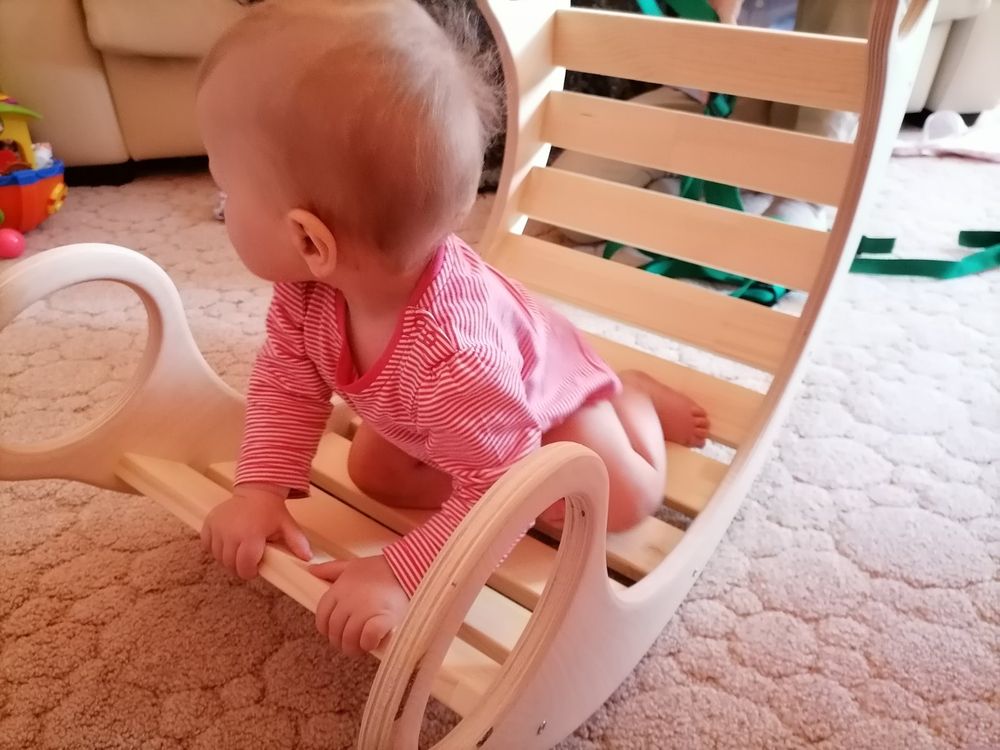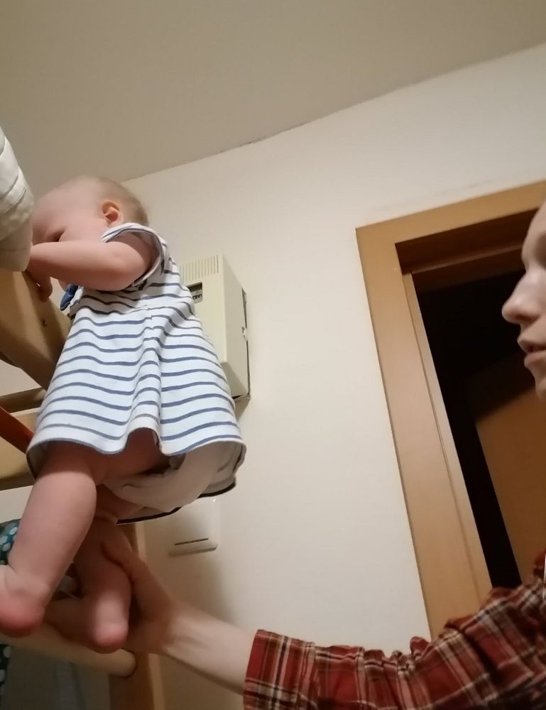 Забралась в 11 мес на лестницу спорткомплекса, до самого верха! Хорошо, что я рядом была (а сестра сфотографировала). Пришлось ограничивать высоту, перемотав перекладины.