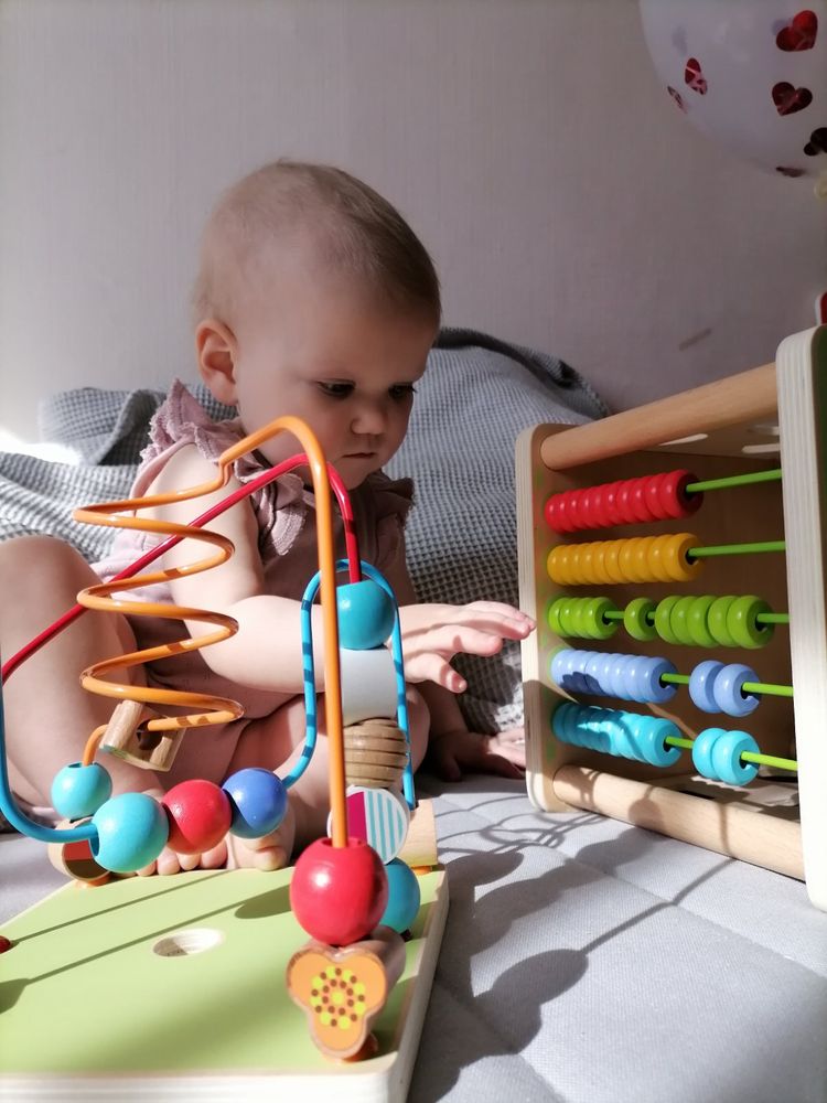 Ровно в 11мес. Лада научилась вставлять плоские кружки в отверстие крышки. Полюбила складывать предметы в ёмкость, подавать всем разные вещи, угощать едой, показывать пальцем и ждать ответа "что это?". Играет с игрушкой Зайкина горка (шарики скатываются вниз в несколько этапов), в целом имеет интерес к разным емкостям и отверстиям: что бы туда засунуть...)) Пирамидку собирать не желает категорически. И разбирать тоже. Шнуровку любого типа на данный момент игнорирует. Башню из кубиков с готовностью рушит. Надеюсь, скоро проклюнется и желание созидать)))
