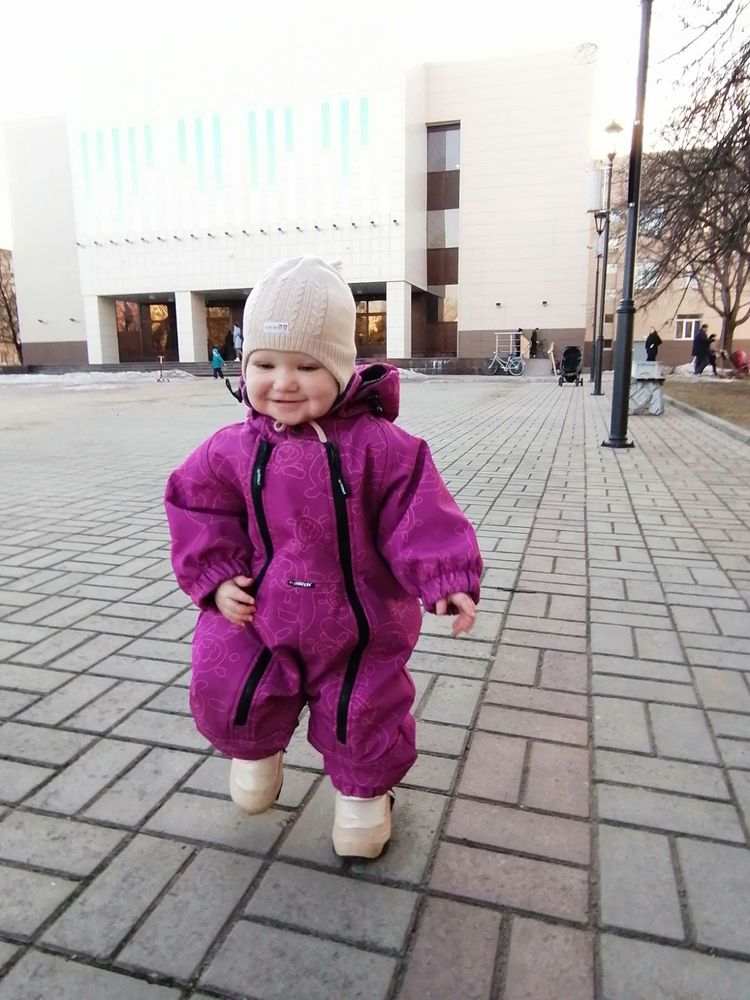 11 месяцев начались у нас с главного достижения: самостоятельной ходьбы. 3,4,6 ... через пару дней 8, 12 шагов! Пошлаааа! И тут же, с первыми шагами и первой капелью за окном, мать обрядила дочку во "взрослый" комбинезон с открытыми ножками и в ботиночки. Ботиночки в первый день Миладе, ясное дело, не понравились. Потом снова начались морозы, и мы вернулись на время к "малышовому" варианту.