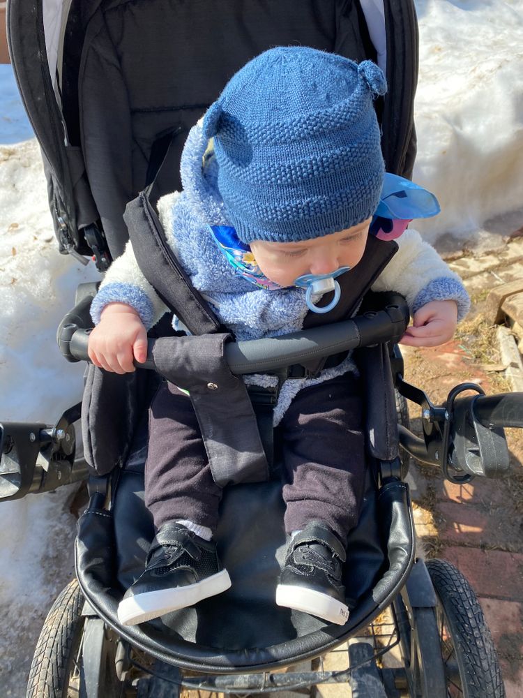 Пересели в прогулку, нужно было сделать это раньше, а то в люльке отказывался лежать, очень смешно там садился))