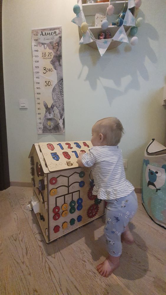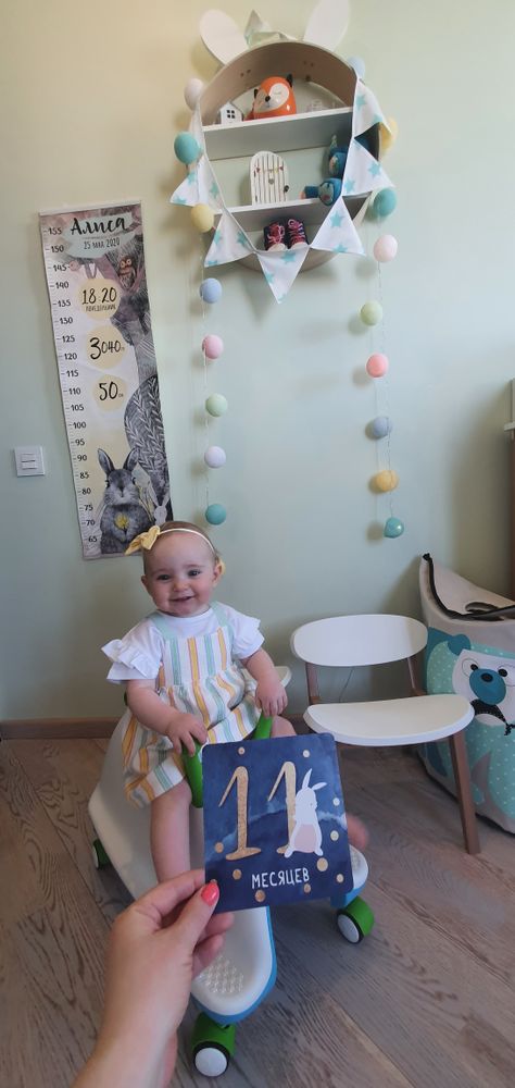 Отчёты по месяцамАлисе 11 мес.Времени на все катастрофически не хватает (( Алиса вырастила еще один зуб.И лезет то ли клык, то ли моляр.Во рту белая точка.Если считать вместе с точкой, то у Алисы 8 зубов.Третий резец снизу вырос безболезненно в принципе.Сухие данные - Вес 9 100 , рост 74 см.Лазить везде это еще один навык, который не проконтролируешь ) Второй - все кидать или швырять со страшной силой. Умеет уже давать или брать игрушку.Может специально дать.Стала понимать держи - бери.Или отдать, например, игрушку если она наигралась.В этом плане полезен наш бэби клуб- пару раз ей девочка дала игрушку в этом клубе и Алиса видимо запомнила процесс.Ну и фаворит - показывать пальчиком на меня, на папу, на книжку, на игрушку.В этом плане я ее не учила ничему) Даже ладушки она сама делает и тоже даже не показывала тк я сама не играла в детстве в это.Наверно она обнаружила, что у нее теперь две ладошки и две руки и ладушки это ее прям радует так делать.На счет плавания - на нудле может какое время подержать горизонтально сама.Ныряет к бортику, держится ручками за бортик сама.Ну и пока еще плавает на спине.Соревнования мы пропустили из за меня.Накрыл страшный ларингит (( Я без голоса уже неделю практически и страшно болело горло.Я привилась от ковида второй прививкой и не понятно то ли это побочка, то ли это я где подхватила.И так было обидно, что не поучаствовали.Прям очень (( Купили Алисе бизиборд и прям очень хорошо ей он зашел.Конечно она лезет сразу на крышу и сидит в нем, как в домике.Вынимает цифры, мучает все, что там крутится.И да бизиборд любит и кошка тоже.Любимая игрушка - ковер детский тонкий.Накрывает им себя и ползает пока не выберется из под него.Может с ним достаточно долго веселится - раскладывать, переворачивать, складывать.Купили ей свой пульт.Иначе за нашим она просто охотится.Я просто убираю этот пульт наш и выдаю ей обычный другой пульт иначе истерика.И да с ключами та же история.Скоро сделаю ей просто любую связку ключей с брелками иначе я уже устала успокаивать.Стала читать ей книжки, показывать кто есть кто.Она лучше в этом плане стала понимать.Ранее это было просто бесполезно)) На счет слов - туча слогов.Уже веду словарь ибо забываю, что она лепечет.А лепечет она постоянно.Настрочила тучу текста) Лень читать даже самой))
