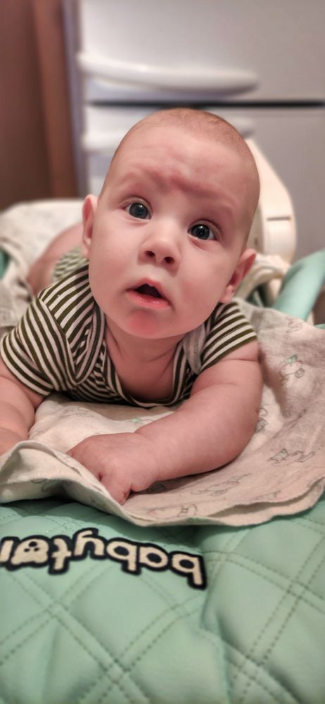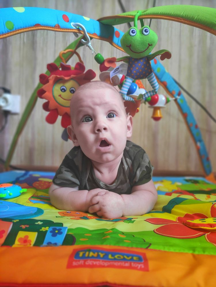 2 недели назад начал переворачиваться со спины на живот, теперь вертится как юла