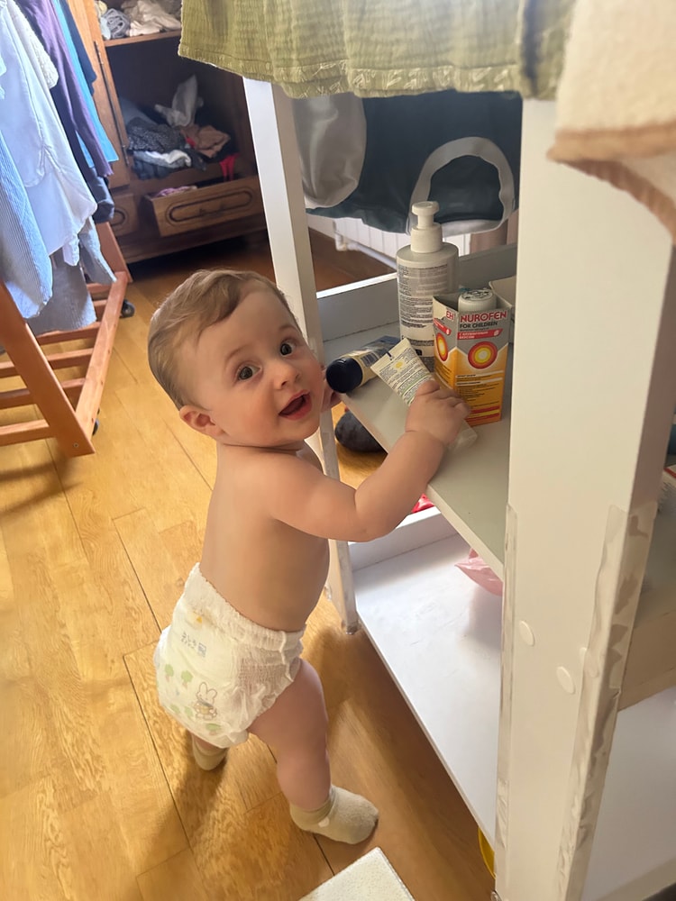 Учу безопасно спускаться, операясь на руку. Ползает очень быстро и активно, но также в основном по пластунски, уже второй месяц пошел …