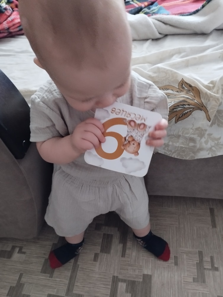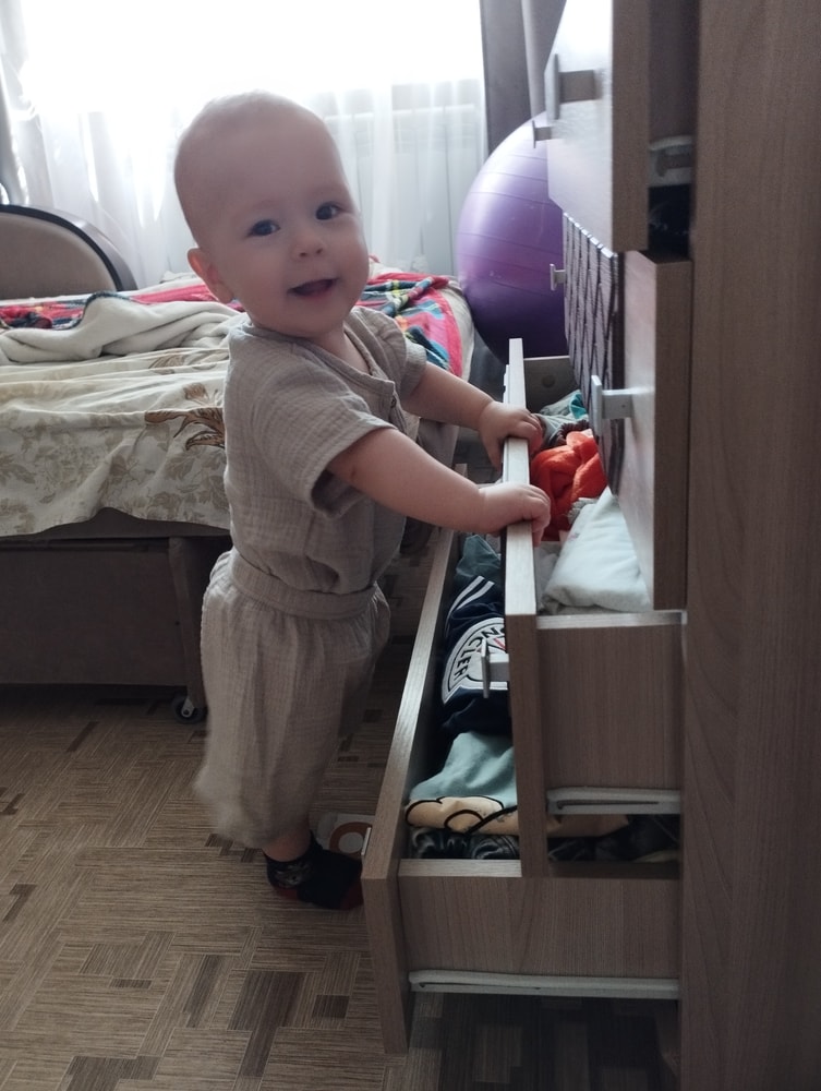 Умелки. Активно встаёт возле опоры. Учится аккуратно садиться на попу, начал отпускать руки от опоры в положении стоя. Может пару секунд постоять.