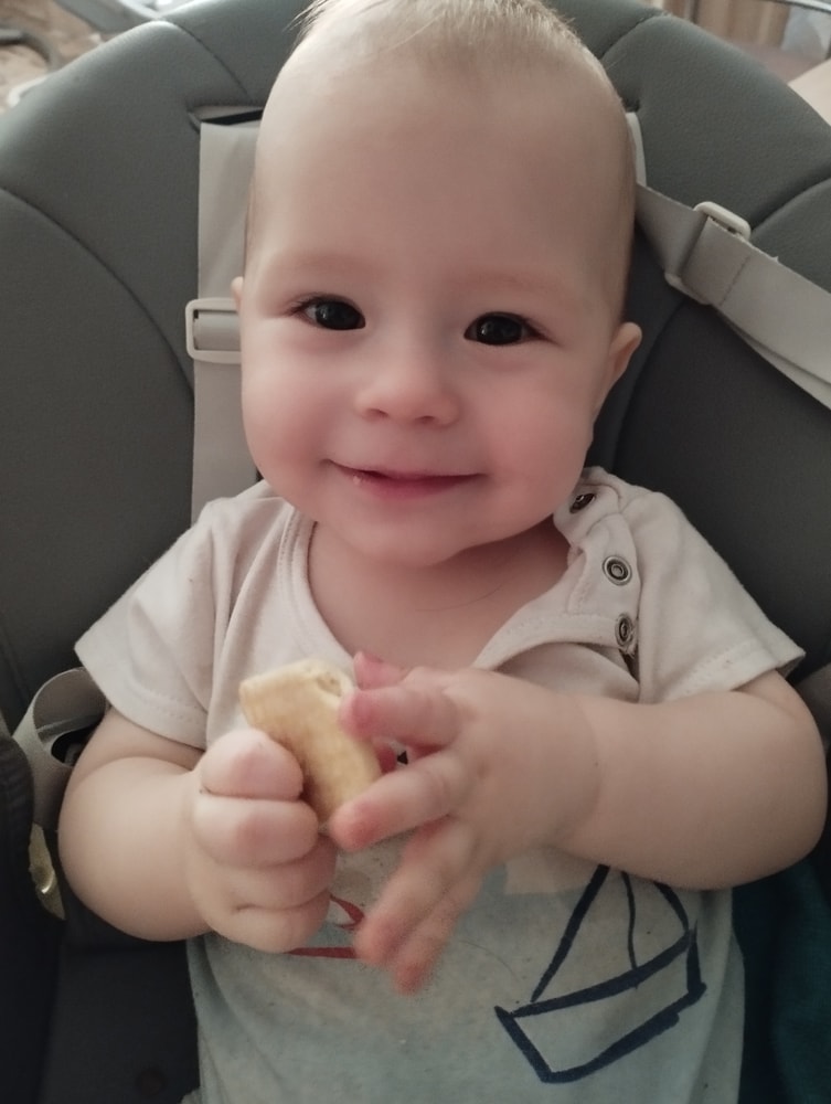 По возможности даю то, что сложнее размазать по себе: сырые овощи, фрукты, горбушу хлеба, варёную курицу. Если есть возможность и желание, приготовлю что-то типа оладушка. Все боле менее жидкое , только из маминой ложки. Если дать свободу и положить несколько вариантов того, что он может взять сам, сын просто набьет рот и будет орать, потому что не сможет прожевать.