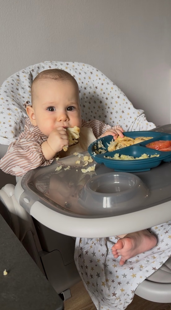 На данный момент тренирует пинцетный захват, только начинает. Учится жевать. Ввела ей тарелочки с кусочками 2 недели назад. Все еще страшно, но уже лучше жует. Наконец-то нашла безопасную для нас подачу огурца 😁 а то уже думала вообще его убрать из тарелок. Кожуру мы откусываем и едим только так, нам такие подачи с кожурой не подходят.