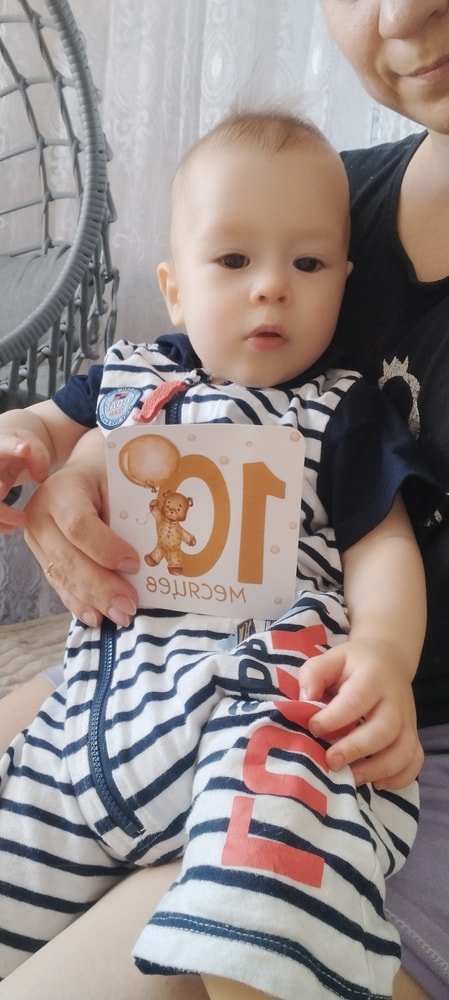 У нас сейчас больше идёт умственное развитие. Появился намек на УЖ. Тычет пальчиком в глаза у игрушек и смотрит на меня. Просто я весь прошлый месяц активно показывала, где глазки. Пора переходить на новые части тела.