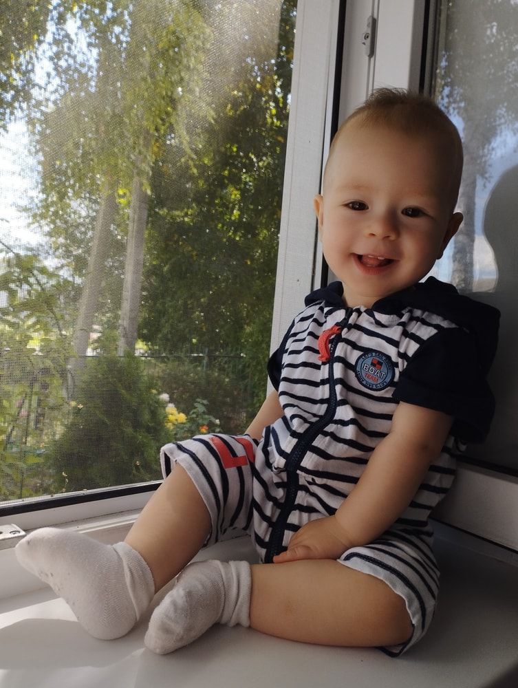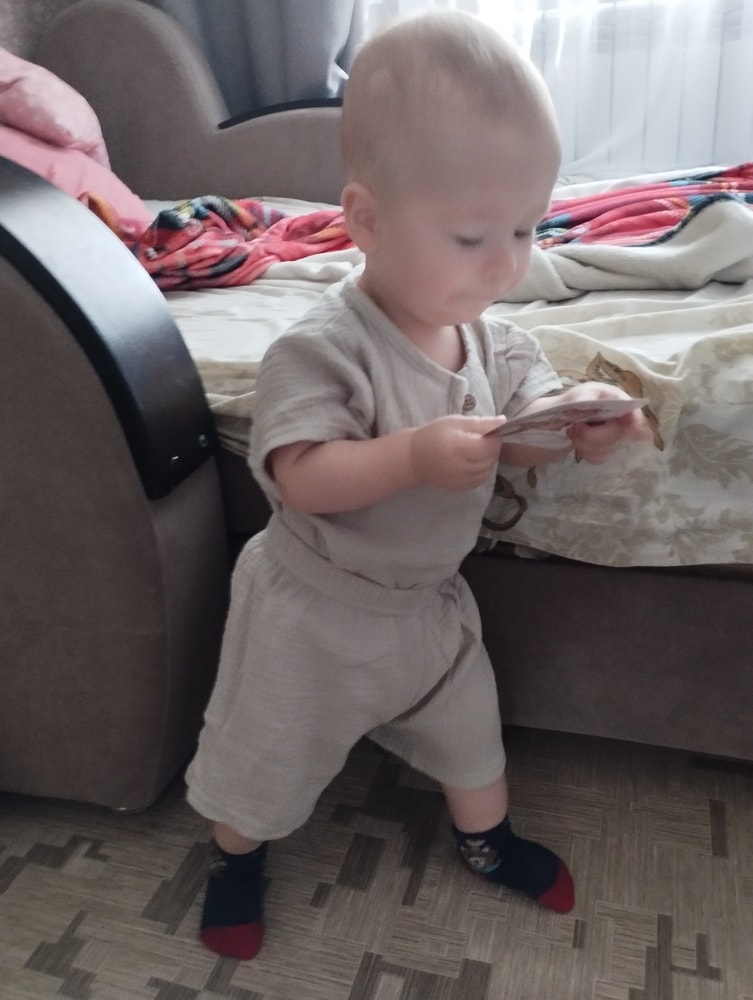 А растет конкретный шилопоп. Сейчас любимый прикол у нас, стоя на диване/кровати, отталкиваться от стены и падать на спину. Ох, у меня сердце останавливается, когда он так делает. Пару раз чуть затылком об подлокотник не шлепнулся. Говорю нельзя, Бобо, а его это ещё больше забавляет. Стал чаще стоять без опоры. Отпускает руки и ждёт, упадет-не упадет. И тоже хохочет от удовольствия. Вдоль опоры почти не ходит.