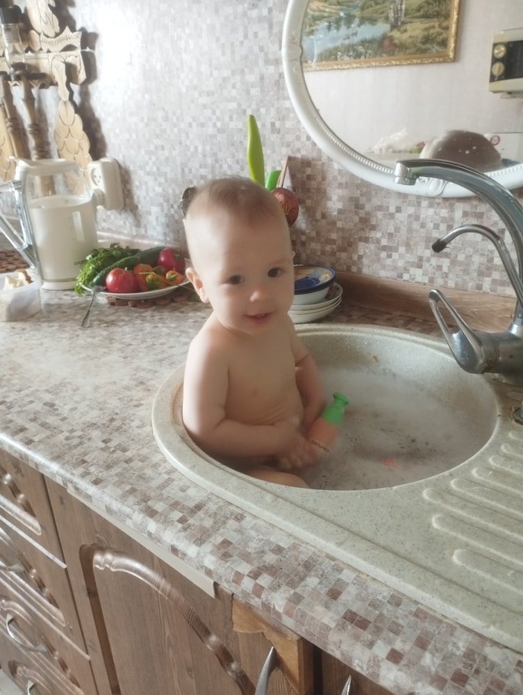 В прошлом месяце свершилось важное для нас событие. Мы покрестили сына. О мой Бог! Я думала поседею от нервов. Слез было море! В конце он просто был без сил. После этого (наверное) дико не любит мочить голову. Нормально сидит плещется пока я не решусь помыть ему голову. Сразу визги-писки и пулей из ванны.