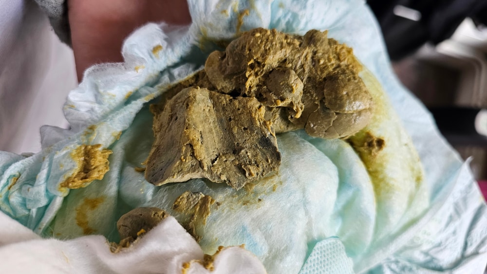 Мила, от баночного пюре тоже ? Чёрные штуки были пару раз и после отмены прикорма