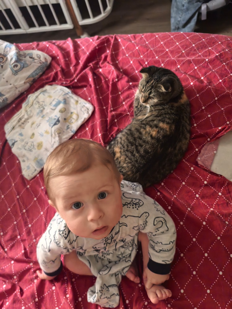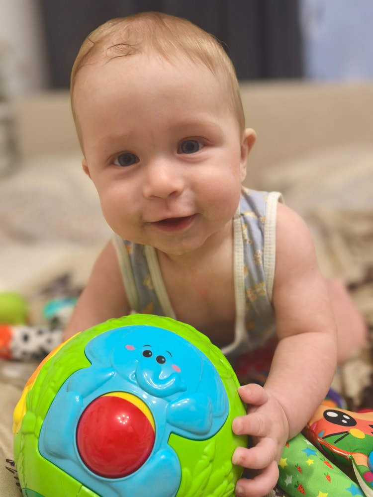 Сидит, встаёт у опоры и совершенно не любит оставаться один - как только сажаю на коврик или кладу в кроватку, чтобы отойти хотя бы в туалет - сразу ор. Жутковато