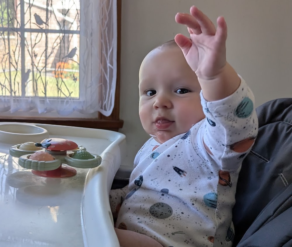 В 4 месяца и два дня я наконец-то сел самостоятельно, (в связи с чем передаю всем привет) - очень уж я зуб точил на эту вертушку на столике. Сижу хорошо, не заваливаюсь, руками себе не помогаю, а все потому, что фундамент у меня серьезный и основательный, с таким не завалишься)) Правда, иногда мне хочется, как и раньше, откинуться назад, поэтому маманя держит спинку моего высокого стульчика в прежнем, полу лежачем положении.