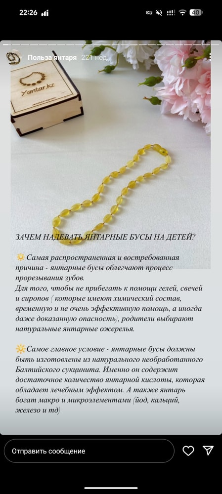 Само то, чтоб порвать, сунуть в нос и подавиться умереть 😁 ну какие ребёнку бусыыыы. Вы ещё верьте, что определенный камень приносит счастье, любовь, удачу и деньги. Янтарь обычный. Ребёнку не нужны бусы, а нужен грызунок. А бусами зацепится и задушится где-нибудь