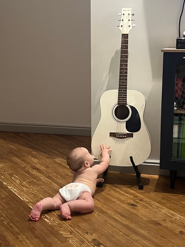 Теперь в зоне риска все в доме. Мамин фикус, папина гитара, общая собака. Ползает быстро, громко хлопая ладошками по полу. По-пластунски так и не ползал, сначала встал на коленочки, потом раскачивался, потом ползал без рук, отталкиваясь ножками, прыжками практически, а потом ррррраз, и пополз.