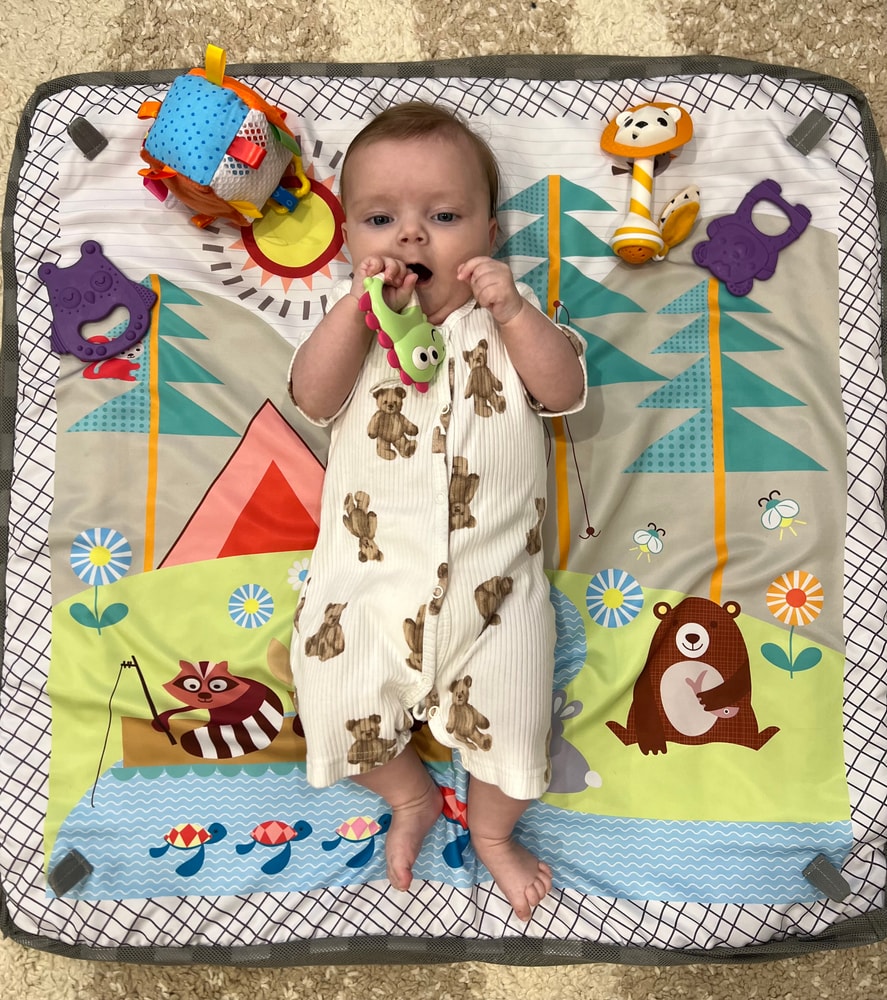 - лежа на животе трогает правой ручкой игрушки в тщетных попытках ухватить и потянуть в рот, выглядит это так: хватает и опускает голову, чтобы покусать одеяло;