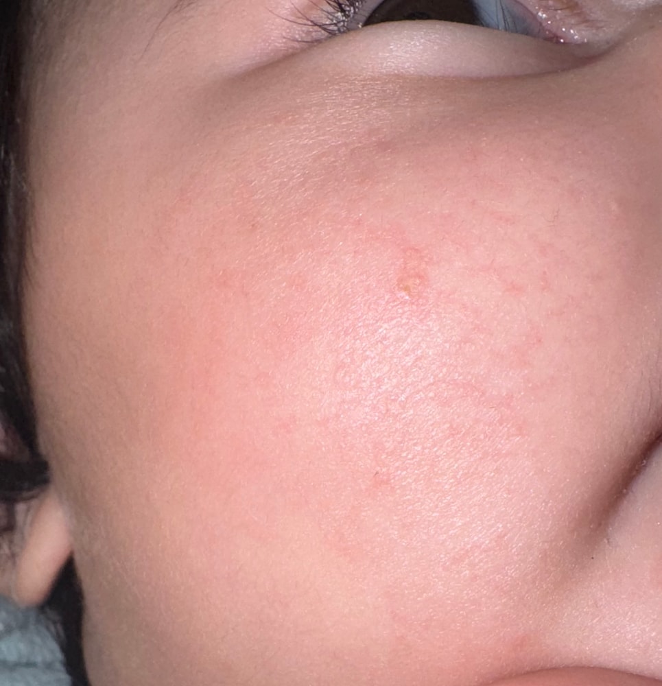 Заметила, что у дочи на щечках какая-то краснота и шелушение, по ощупу как-будто очень сухая кожа. Днем давала яблочное пюре, может быть это аллергия на пюре , не знаю:(