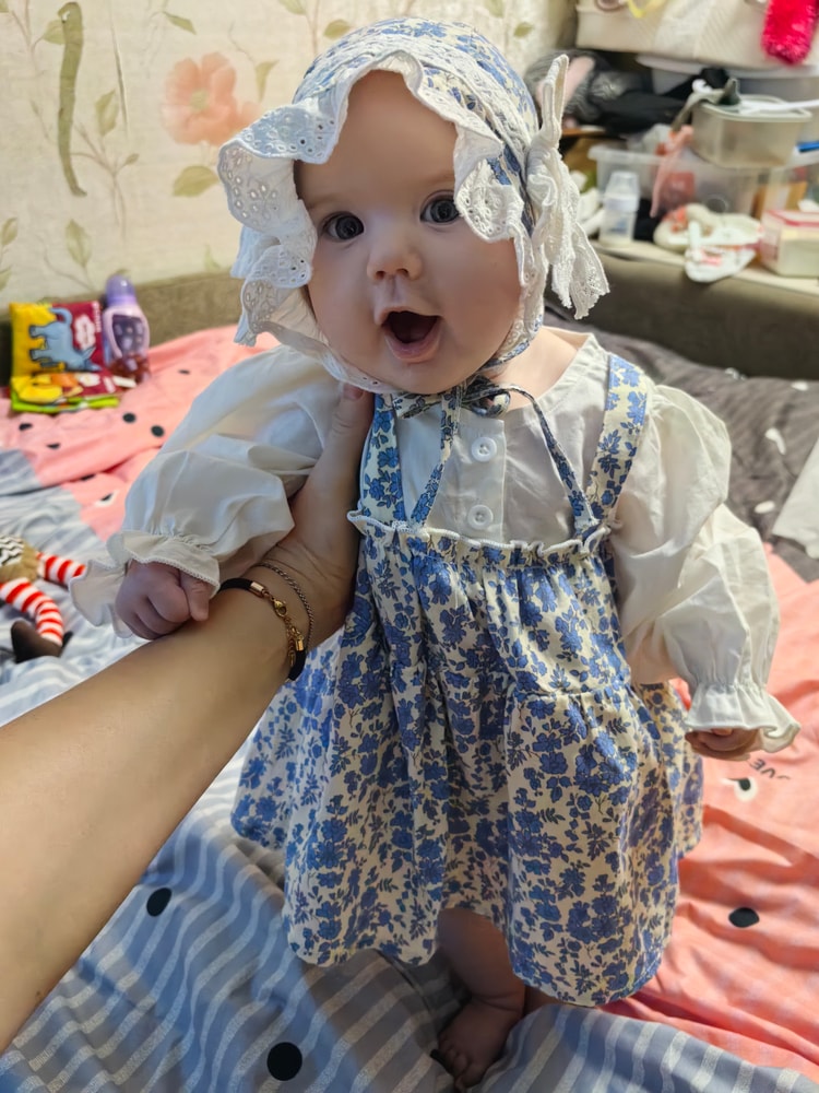 Умеем переворачиваться на животик и обратно) просто обожает платья, если снять истерика😅 болтаем во всю, иногда ее не остановить😁 очень любит своего брата🥰 кушаем с интервалом 3-4 часа. Ночью ест 2 раза.