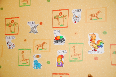 Я конечно не художник но думаю ребёнку будет понятно где петушок , а где рыбка ! Теперь обходя квартиру я показываю ему картинки на стене и рассказываю кто какие звуки издаёт , кто из этих зверей маленький , а кто БОЛЬШОЙ и т.д ! Думаю это хорошая зарядка для головки ! И это не предел , потом планирую развесить весёлый алфавит и цифры ! Да , пока он маленький и не сможет всё запомнить но пусть на подкорку записывает себе ! Как вам ?????