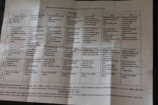 Педиатр наша вполне адекватная, очень хорошая тетенька, грамотный специалист. Вот сегодня с ней в клинике встретились - дала эту бумажку ознакомиться. На прием пойдем через неделю - все подробно расспросим, думаю, что это ОЧЕНЬ примерное меню. Приходить с улицы на час раньше, чтобы приготовить обед из 3 блюд - увольте.