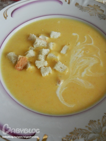 я подобный варю своей уже месяца два - самой нравитя вкус!!! Только я овощи не жарю на масле, я все варю просто и добавляю масло сливочное в готовый супик. Иногда сметану добавляю или сливки.