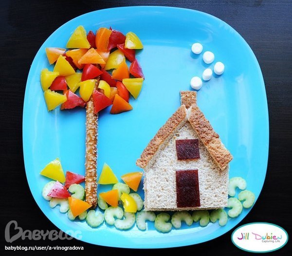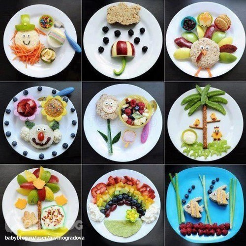 Я Степе вот так еду оформляю!)Не обязательно продукты как тут должны быть,что даю тем и оформляю!Так прикольно ,обед в иговой форме!)))А вообще я готовлю супчики пюре,печеньки делаю в виде человечков очень их любит!Ну и котлетки мы любим очень!Особенно из щуки!