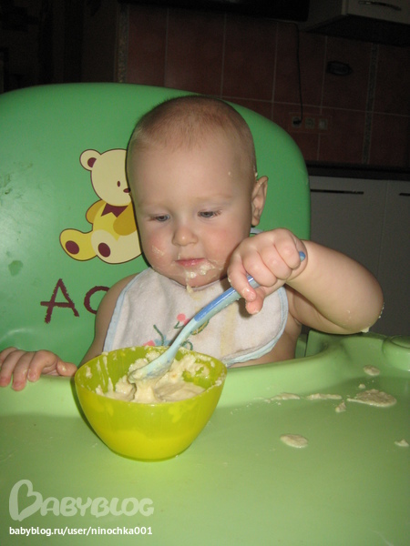С самого начала прикорма ставила перед ним тарелку с ложкой, добавляла немного того что кормлю и вперед, конечно все было на полу, но с чего-то нужно начинать). И вот вчера, взял ложку и сам начал кушать творожок, утром дала уже целую тарелку каши... и о чудо, тоже кушает сам! Может конечно, это громко сказано, но черпает и несет в рот, что донес, съедает) потом я докармливаю, т. к. интерес пропадает мин. через 15)