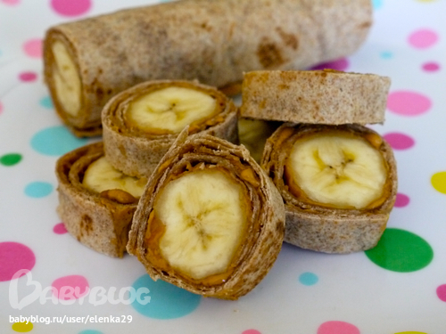 ДесертыЛаваш мажем творогом (можно в него мелко порезать сухофрукты), заворачиваем банан.