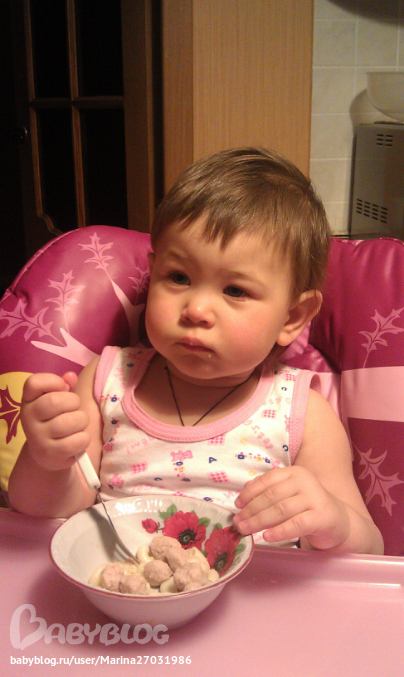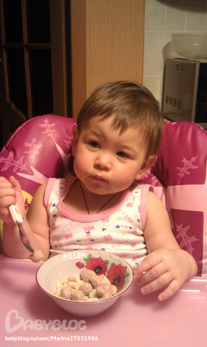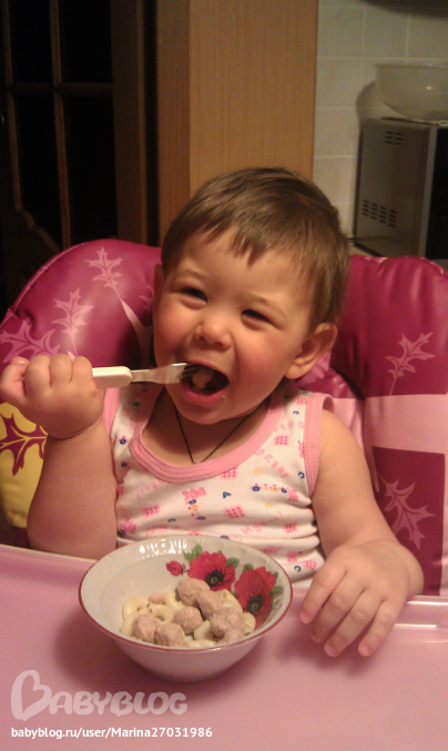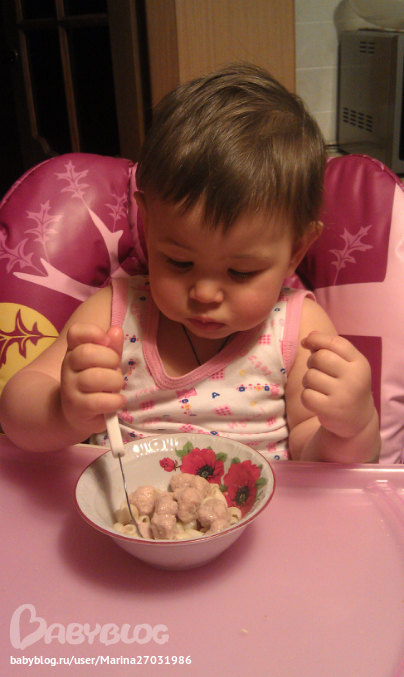 мы еще не учили кушать самой. вилкой сама научилась,это же легко. да и макарошки с фрикадельками просто наколоть. мы в последнее время кушать плохо стали,вот я ей и предложила самой,она все съела. долго ковыряла,но все доела до конца. а с ложкой так не получится,будет все либо на ней,либо вокруг. правильно держать еще не умеет. боком как-то держит. когда пытаюсь показать как надо взять,то рычит на меня))))