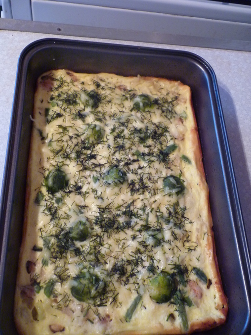 горсть замороженных : стручковой фасоли, кабачёк резаный кубиками(можно и свежий!),брюсельская капуста 9 штучек. 3 маленькие картошки. А вообще чего есть подрукой из овощей то и клади. Форму смаж растит.маслом хорошенько,и бортики тоже. Выложи овощи и залей заливкой.