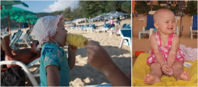Первое знакомство с этим желтым овощем у нашей Настены произошло в Тайланде в 1,3 мес (там же попробывала и стала есть памелу, виноград, ананас , орехи и королевские креветки - как же без них ).
