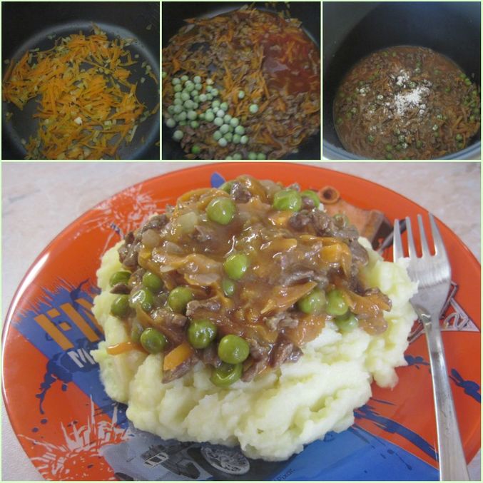 Лук порезать,морковь натереть на терке, мультиварку включить на режим выпечка, добавить каплю масла, как разогреется отправить туда лук с морковкой. минуту помешать, следом порезаную говядину, перемешать, закрыть и выключить. Через минуты 3 открыть, добавить томатную пасту и горошек, долить водички и перемешать, закрываем, включаем тушение, мне хватило 30 минут, за 5 минут до окончания готовки добавить чуть-чуть крахмала для густоты соуса. Подавать с любым гарниром, у нас картофельное пюре. Приятного аппетита)))