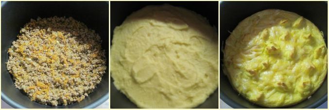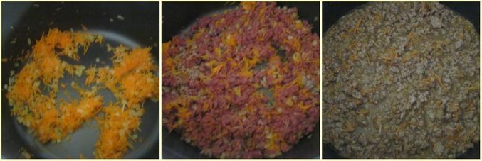 И так, картофель ставим варить, тем временем занимаемся фаршем. Можно на сковороде на самом маленьком огне, я делала в мультиварке на режиме выпечка. Наливаем чуть растительного масла, закидываем мелко порезаный лук, натераем на мелкой терке морковь и чеснок (у меня был один маааленький зубчик) и отправляем к луку, тушим минутки три. Следом фарш (я проворачивала 2 раза), хорошо перемешиваем, что бы не было больших комков, когда мясо потеряет цвет наливаем водички, так что б до конца не покрывпало наши продукты, если вы солите ребенку пищу, сейчас самое время это сделать, тушим минут 10-15 под полуприкрытой крышкой. Тут я сделала ошибку, чего вам не советую, я выпарила всю жидкость (зачем? и о чем я думала??). Так вот, жидкость пусть останется, не вся, но так что б сухо не было.
