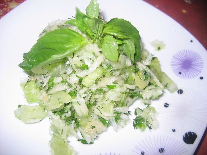 на терке очищенные яблоко и огурец, мелко порезаный корешковый сельдерей, зелень