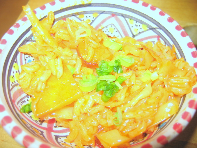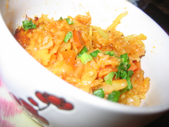 Шинкуем капусту (количество зависит от вашей посуды и от вашей любви к тушеной капусте), лук-кубиками (я готовлю без лука), морковь на средней терке. На оливковом масле обжариваем слегка (!) мокровь и лук, добавлем зеленый лук. Добавляем капусту и жарим на максимальном огне, помешивая. Затем добавлем томатный сок и приправы, уменьшаем огонь и тушим. Рис я предварительно отварила почти до готовности, затем добавила к капусте и налила воды, чтобы все хорошо тушилось.