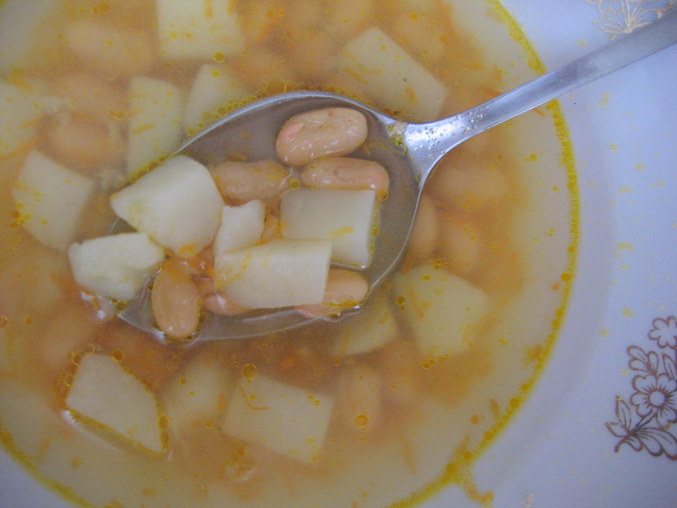 На овощном бульоне (помните, я писала, что бульон от овощного супа-пюре пригодится? вот как раз на кастрюльку фасолевого супа добавляю кружку овощного бульона). Картофель, морковь, фасоль. Минимум ингредиентов) Фасоль любая, обычная или конвервированная, кому как угодно, мы не брезгуем консервированной белой фасолью)