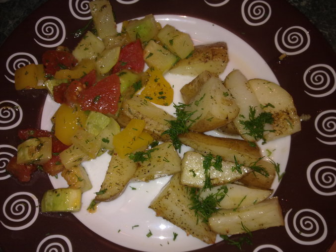 Молодой картофель хорошо и долго промываю с щеткой, режу на дольки, солю и укладываю выпекать в духовку до готовности (накрываю фольгой). Рагу: кабачок, помидорф и перец нарезаю и тушу в сотейнике с добавлением соли и масла). Все готово, быстро и всем понравилось!